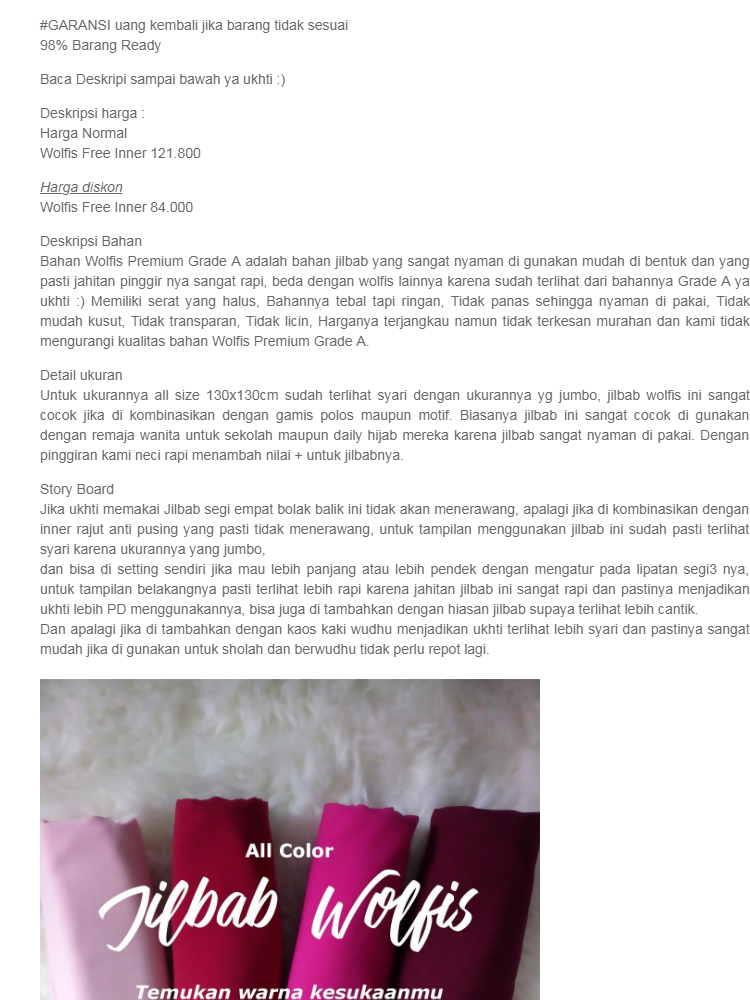 Informasi tentang Termurah Zannah Hijab Jilbab Segi4 Wolfis Premium Segi Empat Persegi Jilbab Jumbo Syari Khimar Segi4 Termurah Paling Laris Atasan Dress Muslim Gamis Syari Jumbo Busui Freindly Jilbab Polos All Size 130cm Best Seller - Free inner kali ini, semoga bisa menjadi bahan rujukan dan perbandingan harga produk bagi anda yang ingin berbelanja. JIka anda ingin berbelanja dengan Hemat, aman dan nyaman, Silahkan anda bisa klik tombol atau tulisan BELI SEKARANG di atas dan akan langsung terhubung dengan LAZADA, TOKOPEDIA, BUKALAPAK, BLIBLI, BLANJA dll. Terima kasih atas kunjungannya dan selamat berbelanja. Simak juga informasi harga dan produk yang anda cari lainnya dipostingan selanjutnya.